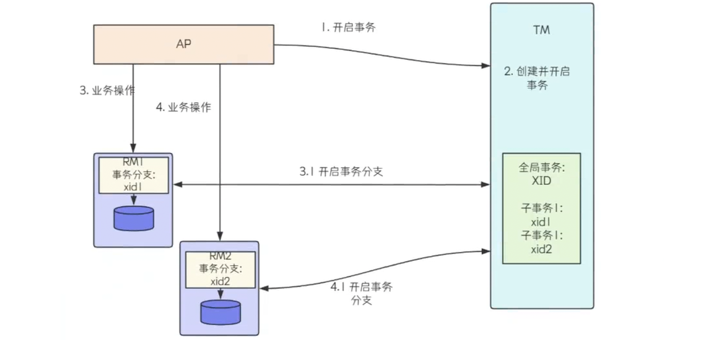 | 3. AP向TM发起一个全局事务,生成全局事务ID(XID),XID会通知各个RM |