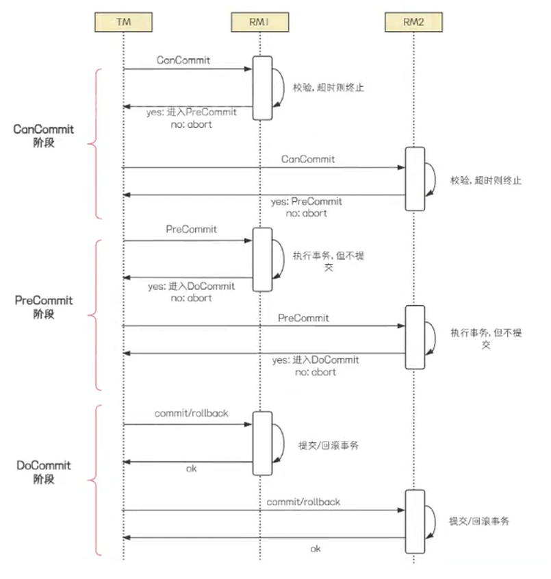 3PC(Three-Phase-Commit),是2PC的改进版本,共分为 CanCommit,PreCommit 和 DoCommit三个阶段。