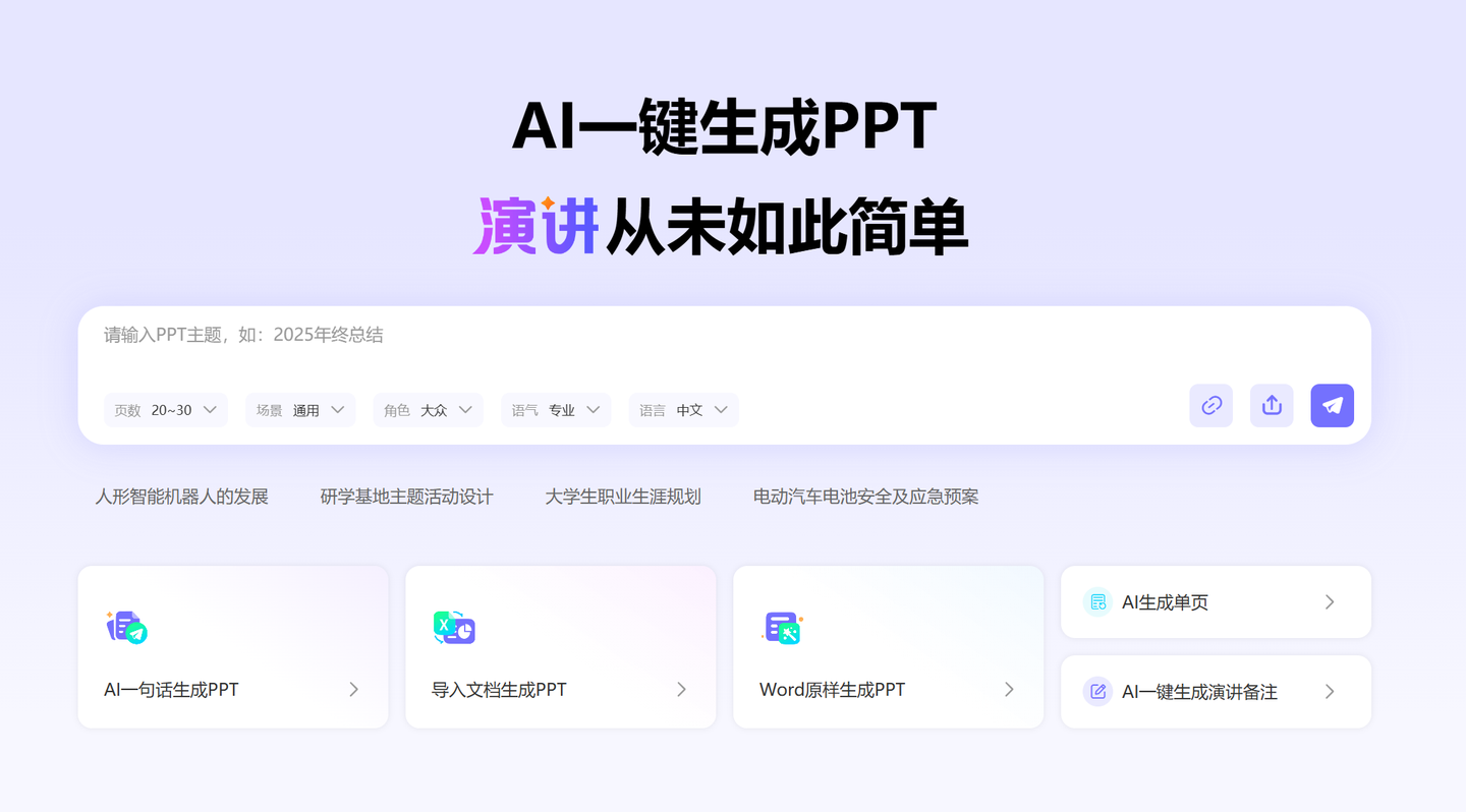 - 定制化程度高,适配多样需求:支持选择生成页数、语言、场景、面向人群等参数,在工作总结PPT生成时,可根据汇报对象和场景调整PPT的详细程度和风格。例如面向领导的总结汇报,可以选择简洁专业的风格;面向团队的内部总结,可以选择详细全面的风格。