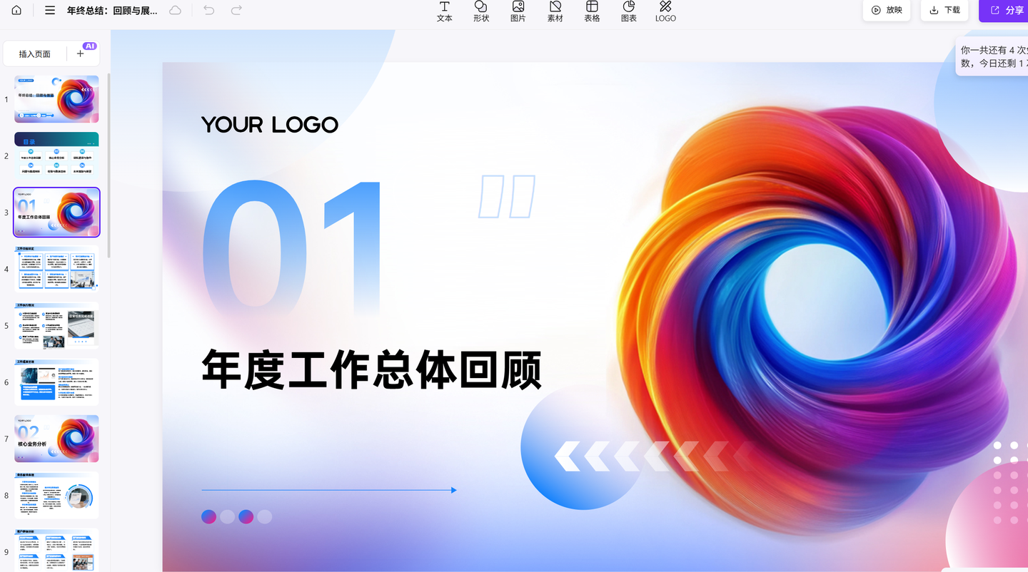 - 基础功能免费,性价比高:对于日常工作总结PPT生成需求,其免费版就能满足基本使用,支持无限次生成PPT初稿,仅部分高级功能需要付费解锁。对于预算有限的学生或职场新人来说,是一款非常实用的工作总结PPT生成工具。