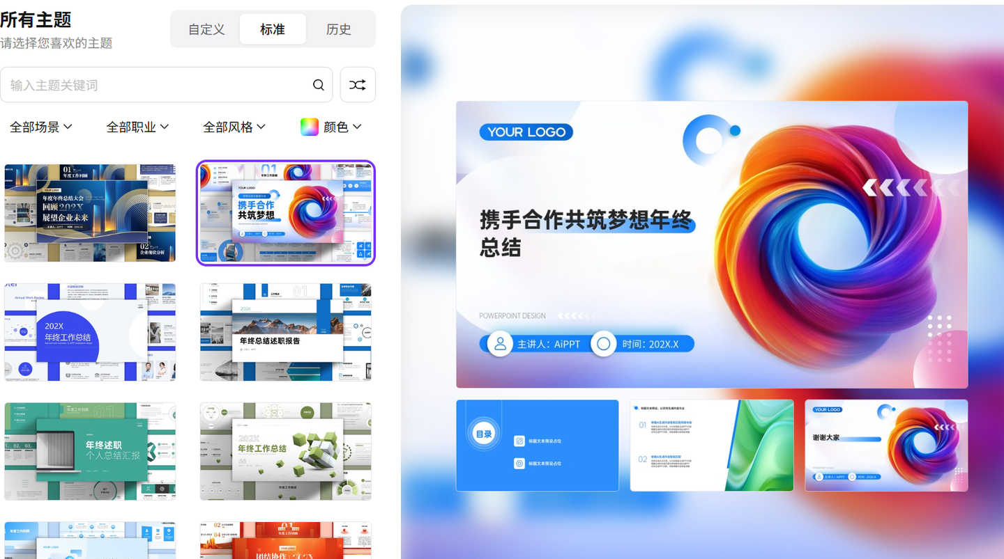 - 智能模板适配,风格更统一:内置10万+模板库,覆盖商务汇报、学术答辩等28个场景,其中包含大量专门针对工作总结的模板。在进行工作总结PPT生成时,它能根据输入内容的行业和主题,智能推荐合适的模板风格,并且支持企业自定义模板上传,确保团队输出的PPT风格统一。我所在的团队就上传了定制化模板,用AIPPT生成工作总结PPT后,无需再调整格式就能直接使用。