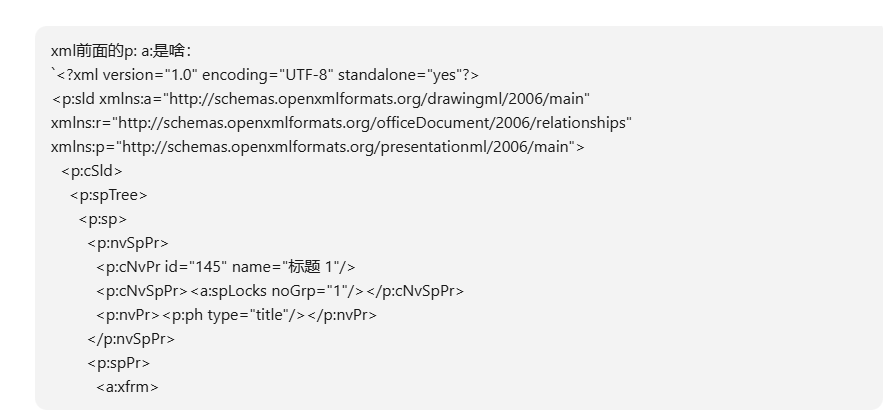 将pptx解压缩后,得到ppt/slides/slide1.xml中,有如下标签, 那么标签中的p: 和a: 意味着什么呢?