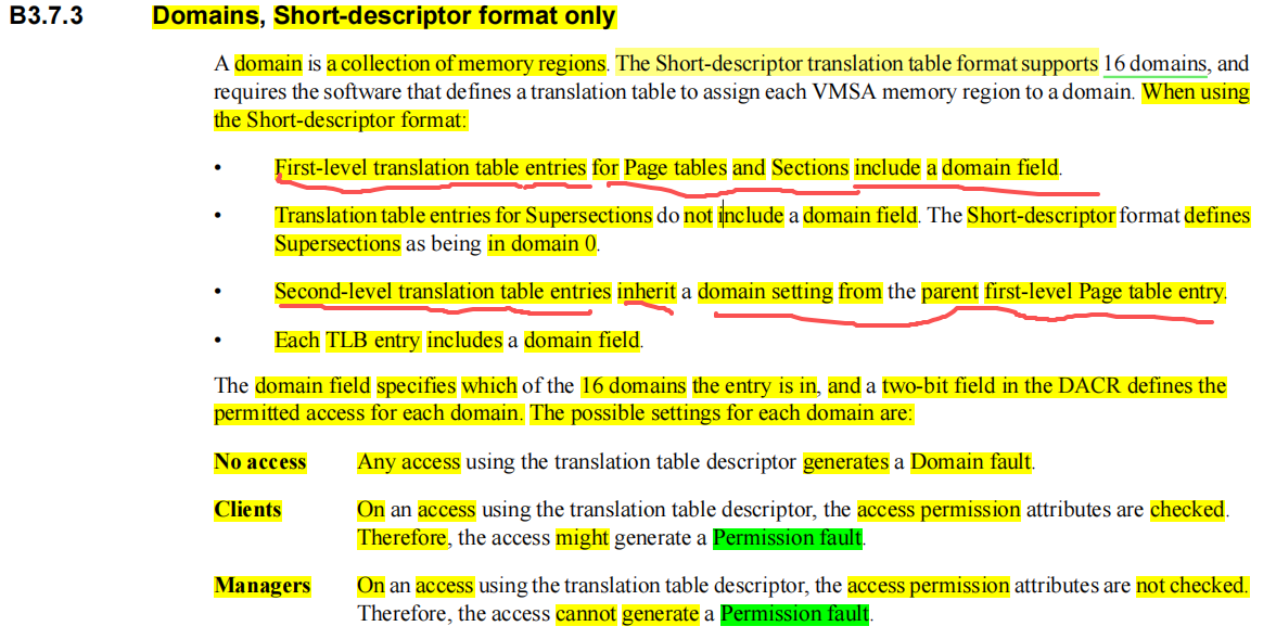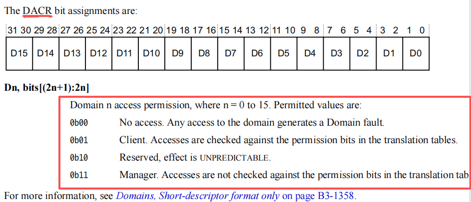 任何对标记为No access类型内存 domain 的访问,会生成Domain fault。 - 0b01:Client