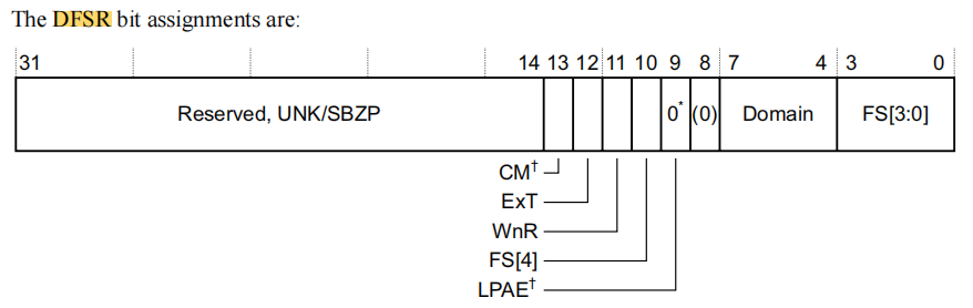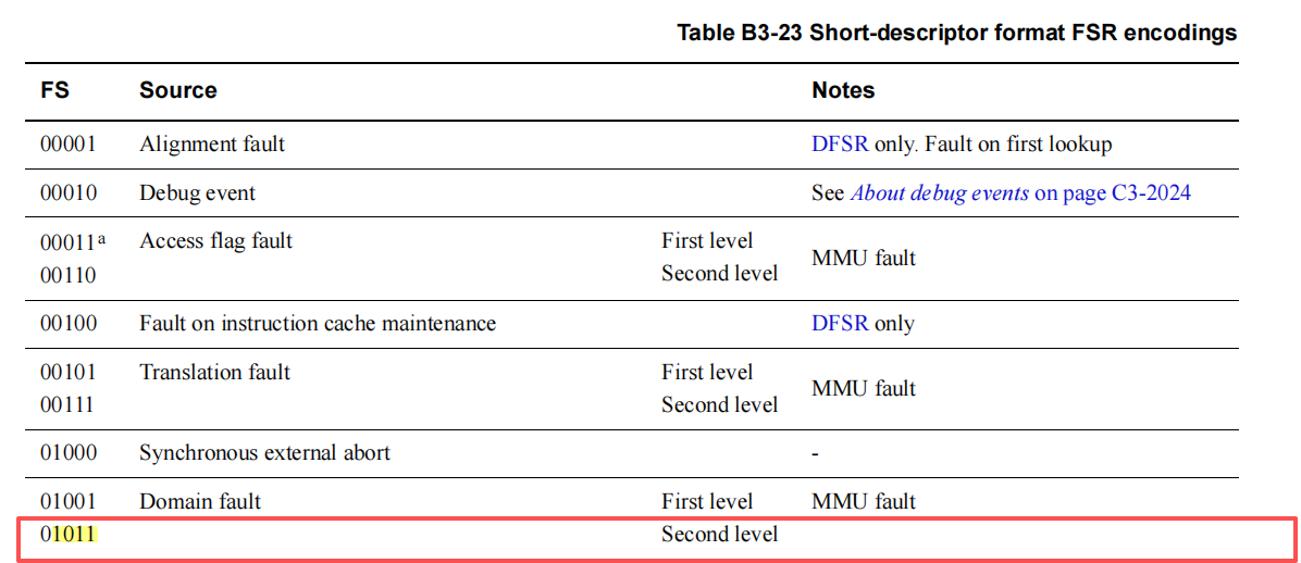 所以得知 domain number 为 0x1 (即 DOMAIN_USER) ,原因 fault 类型是 0xb (0b01011),即下图中的 Second level 页表访问引发的 Domain fault: