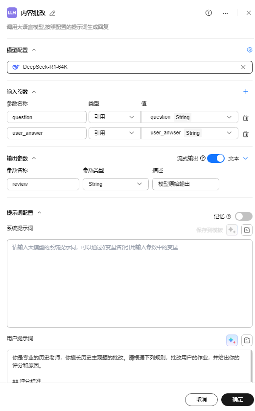 在业务控制台的智能体应用管理页面的编排工作流中,设置内容批改阶段的属性参数,主要包括节点名称、模型配置、输入参数、输出参数、系统提示词、用户提示词: