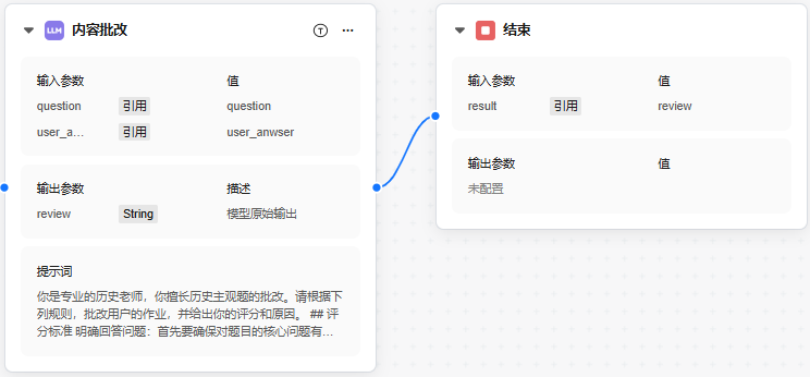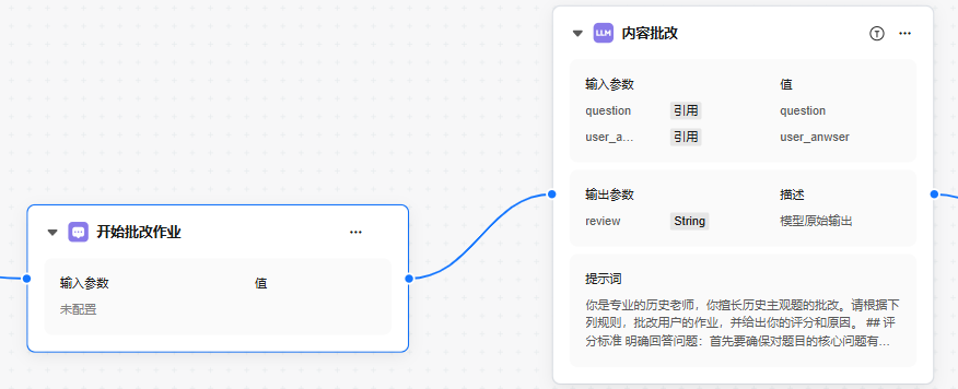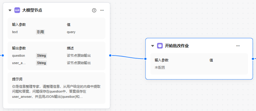 在业务控制台的智能体应用管理页面的编排工作流中,为大模型节点添加操作流程的下一阶段,开始批改作业阶段: