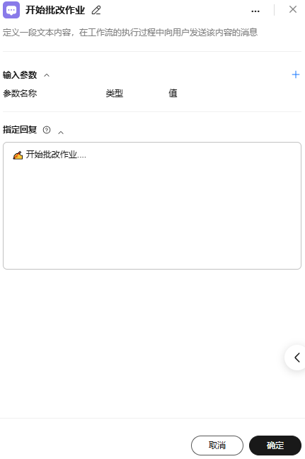 在业务控制台的智能体应用管理页面的编排工作流中,设置开始批改作业阶段的属性参数,主要包括节点名称、输入参数以及指定回复: