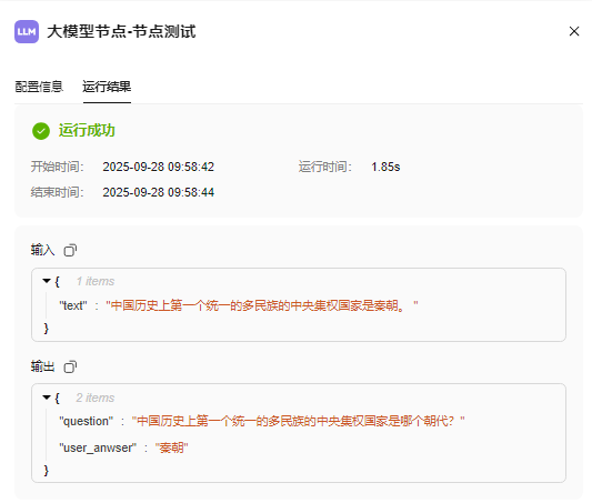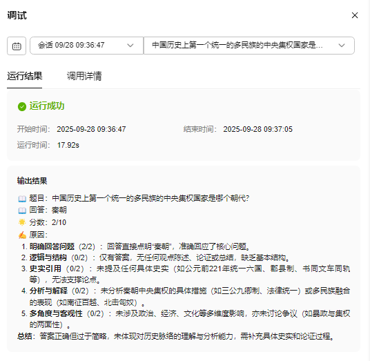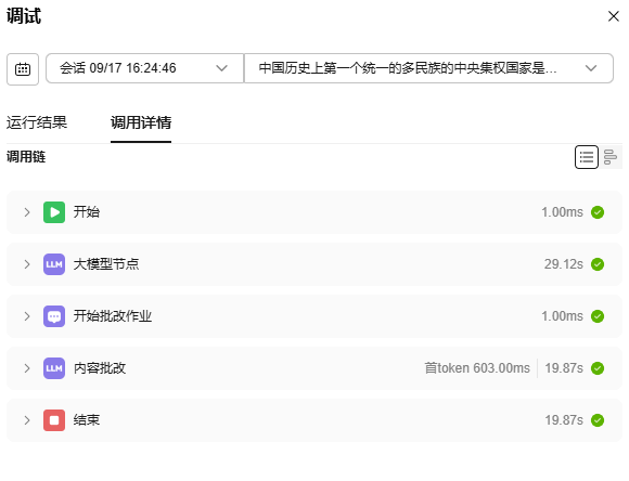 在业务控制台的智能体应用管理页面的编排工作流的大模型阶段测试中,查看测试的运行结果: