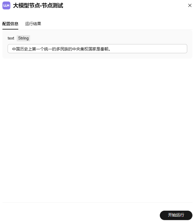 在业务控制台的智能体应用管理页面的编排工作流的大模型阶段测试中,输入需要测试的配置信息: