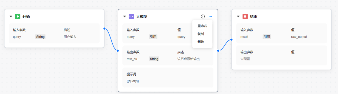 在业务控制台的智能体应用管理页面中,编排工作流智能体应用的操作流程,默认操作流程包括开始阶段、大模型阶段以及结束阶段,用户可根据实际需求增加删除修改工作流的操作阶段: