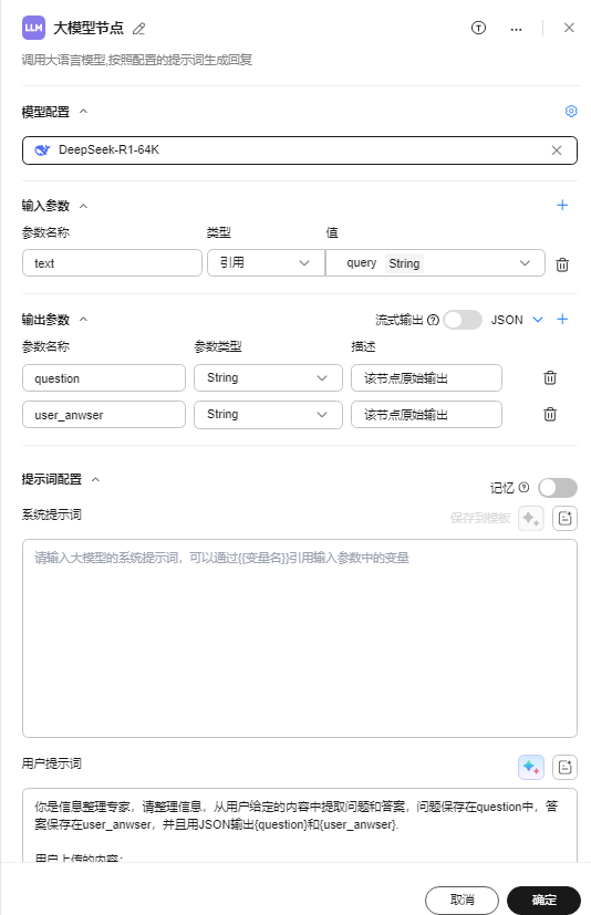 在业务控制台的智能体应用管理页面的编排工作流中,设置大模型阶段的属性参数,主要包括阶段名称、模式偏好、模型配置、输入参数、输出参数、系统提示词、用户提示词: