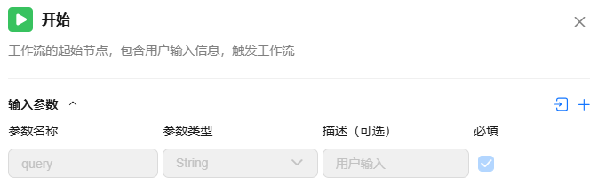 在业务控制台的智能体应用管理页面的编排工作流中,设置开始阶段的属性参数,主要包括输入信息: