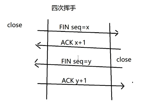 第 1 步(左→右):FIN seq=x左边(主动方)先喊:"我没话说了(close)",对应发 "结束请求"(FIN),x 是他最后一句话的 "序号"。