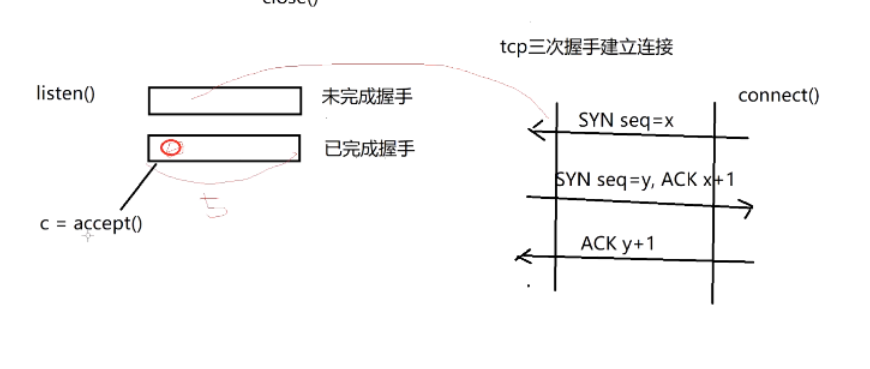c,就是服务器和这个客户端单独通信的 "通道"(相当于奶茶店给这个顾客开一个 "小窗口" 点单); - 图里 "已完成握手" 队列里的红圈,就是