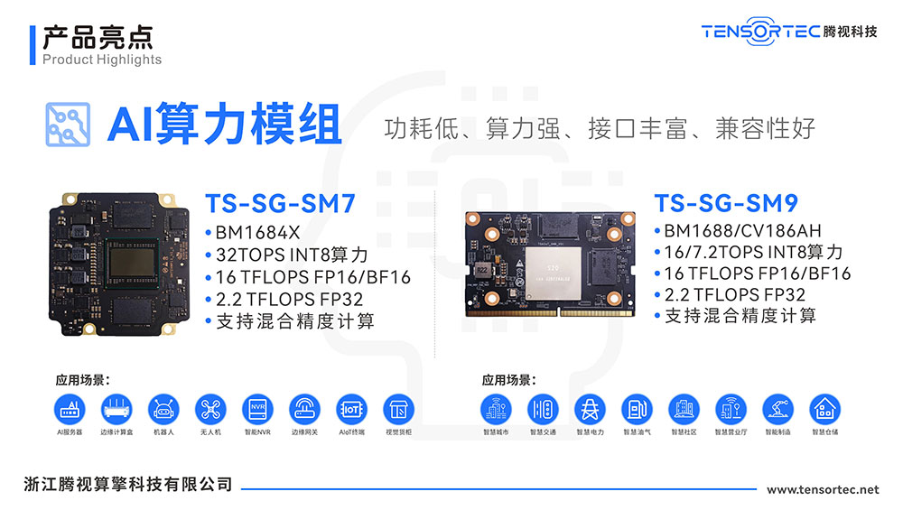 腾视科技TS-SG-SM7/9系列AI算力模组,该系列产品搭载算能高集成度处理器BM1684X/BM1688/CV186AH等芯片,以超强算力、超低功耗和丰富接口为核心优势,为人工智能场景提供高效、灵活的算力支持,助力AI微服务器、AI边缘计算终端、工业控制、无人机及AIoT等终端领域实现智能化突破。