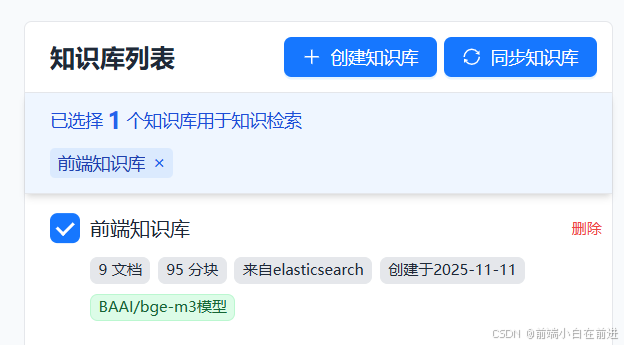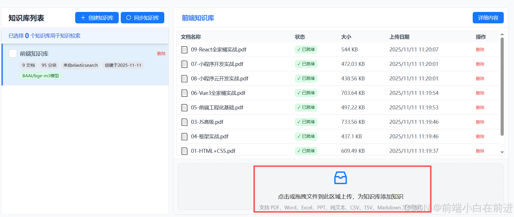 创建自己的知识库,给自己的知识库命名,并且上传自己的知识库文档,我将前端的面试知识库给导入到了知识库中:
