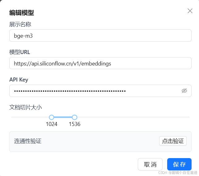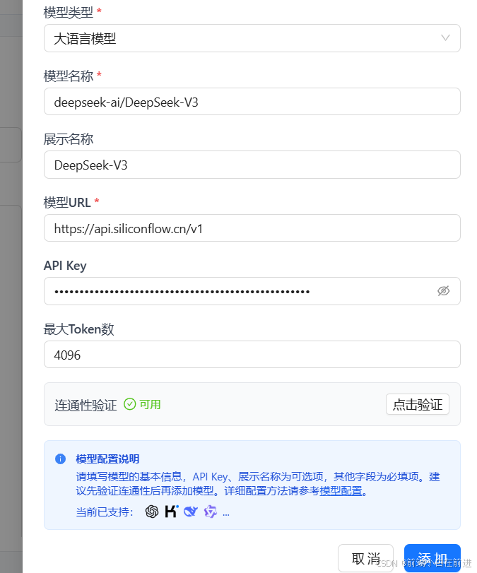 注意自定义模型需要添加两种模型:大语言模型和向量模型