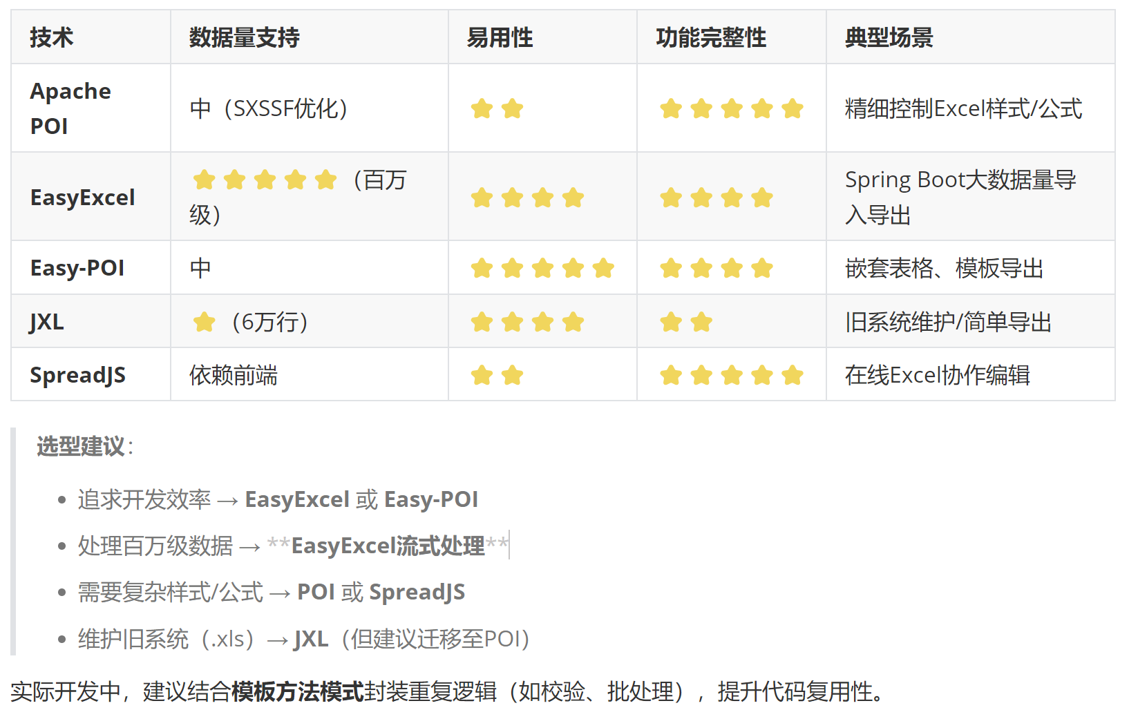 适用场景:大数据量导入导出(>10万行)、Spring Boot项目快速集成