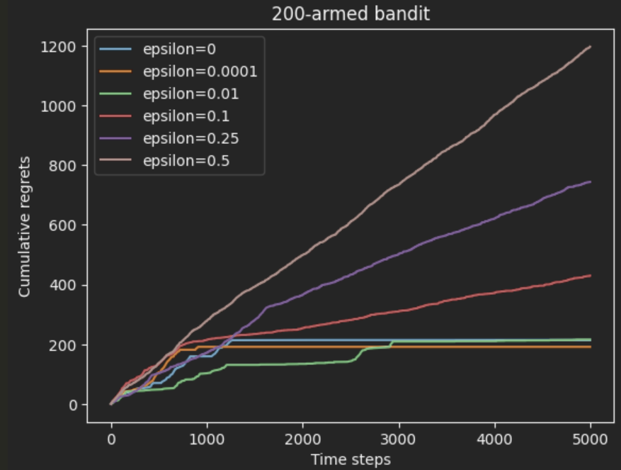 EpsilonGreedy(BernoulliBandit(K), epsilon=e) for e in epsilons