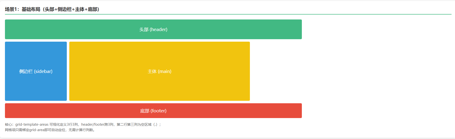 <p class="desc">核心:grid-template-areas 可视化定义3行3列,header/footer跨3列,第二行第三列为空区域(.);<br>网格项只需绑定grid-area即可自动定位,无需计算行列数。</p>