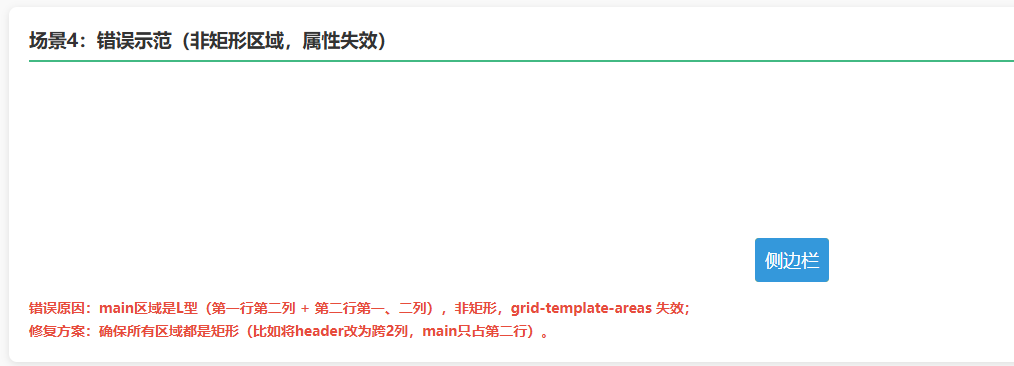 <p class="desc error-tip">错误原因:main区域是L型(第一行第二列 + 第二行第一、二列),非矩形,grid-template-areas 失效;<br>修复方案:确保所有区域都是矩形(比如将header改为跨2列,main只占第二行)。</p>