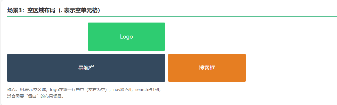 <p class="desc">核心:用.表示空区域,logo在第一行居中(左右为空),nav跨2列,search占1列;<br>适合需要"留白"的布局场景。</p>