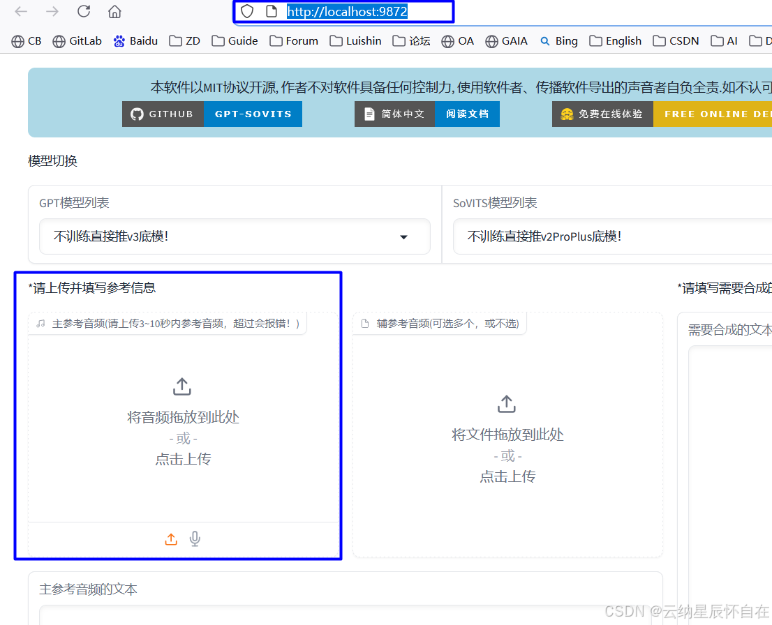 当第四步点击<开启TTS推理WebUI>后,浏览器自动弹出另一网页:http://localhost:9872/