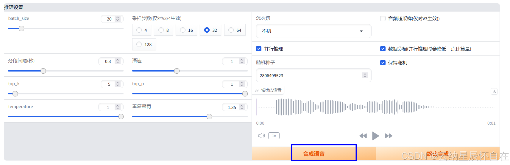 提供诸多AI配置参数,可以基于实际音效进行参数调优。最后点击"合成语音"。