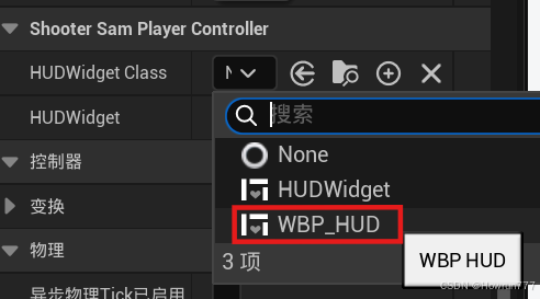 打开BP_XXXPlayerController玩家控制器蓝图, 选择我们的十字准星蓝图WBP_HUD;
