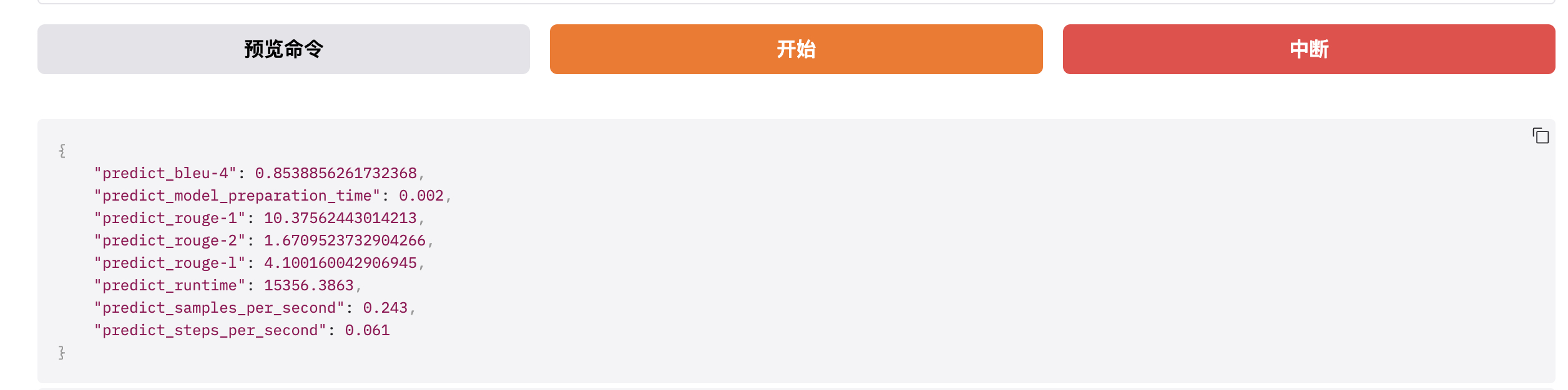 - predict_steps_per_second:每秒执行的 step 数量,模型每秒钟能够执行的 step 数量。模型每生成一个 token 就是一个 step。如下,0.061 step/s 表示每秒生成约 0.061 个 token。