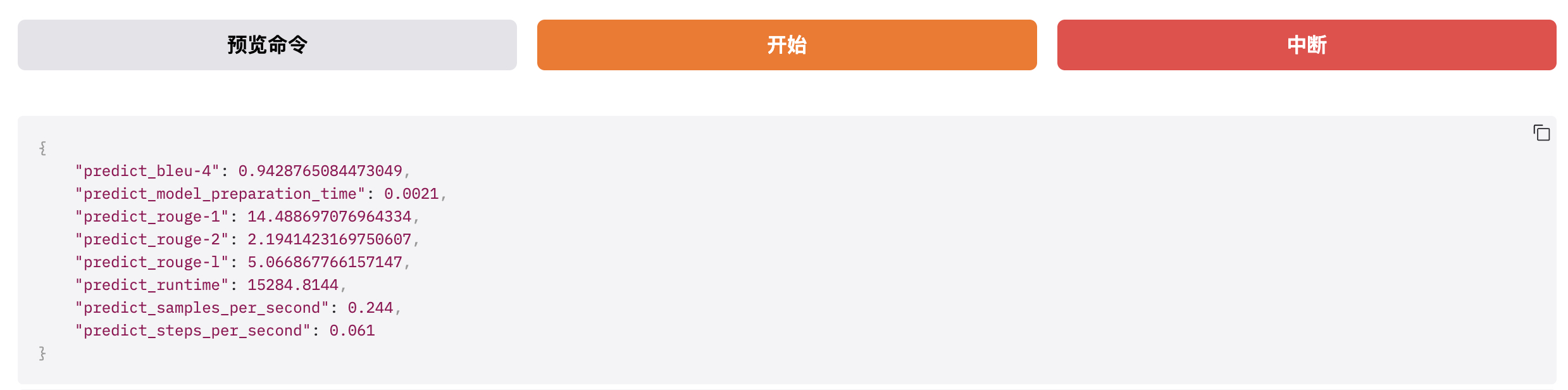 - predict_rouge-l:ROUGE-L 表示最长公共子序列匹配率,衡量模型生成文本与参考文本之间最长公共子序列(Longest Common Subsequence)的匹配程度,即:整句的语义连贯性和语序一致性。同上,最大值为 100。如下,rouge-L=4.10 中等分数,表示模型生成的文本语义完整、逻辑通顺,虽然句式和标准答案不同,但核心信息完整、语序合理,能准确回答问题。