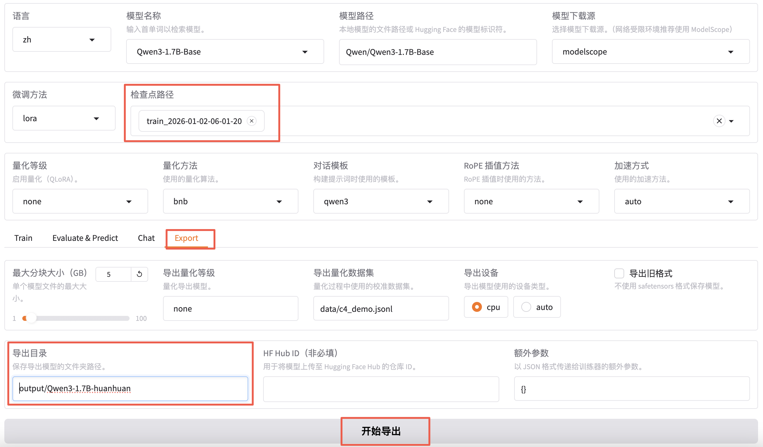 检查点路径选择我们刚刚微调好的模型,切换到 export,填写导出目录 output/qwen3-1.7b-huanhuan。