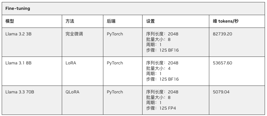 - Llama3.2 3B 完全微调:每秒 82739.2 tokens 的处理速度。