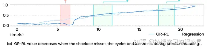 最近看的一些在高复杂性,时长较长的场景中使用强化学习算法提升效果的案例,例如《关于gr-rl与pi-0.6(π₀.₆)的一些想法》,论文中展示的制作咖啡,穿鞋带等实验让人印象深刻。它们在技术上有一些共同的特点,即使用强化学习,先用离线数据进行offline预训练(不是传统的模型学习,而是强化学习中的offline),然后在online与环境进行交互学习。在第一阶段的离线学习完成后,可以有一个基本的策略与critic函数,这样在线学习阶段就可以减少交互时探索的空间,整体上两阶段的学习比一阶段的学习可以较大的降低总体的学习时长。第一阶段的offline强化学习是一个很大的topic,有很多经典的算法,例如CQL/IQL/Cal-QL/TD3+BC等。td3+bc也是gr-rl论文中在离线强化学习阶段使用的算法。如下图所示(来源于gr-rl论文),在离线阶段训练出的critic函数可以充当一个progress predictor,一方面可以充当一个任务的进度显示器,对数据中的噪声(下图中深蓝色曲线的波动部分)进行一些filter,另一方面在强化学习算法中可以对策略进行监督指导。