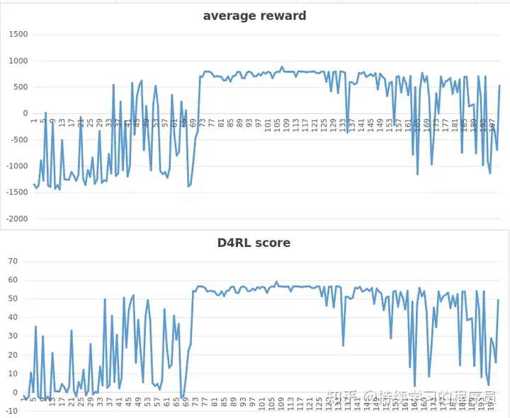 从下图可以看到,在中间的过程算法整体上收敛后有一个较好的效果(图中reward是在用离线数据训练出来的策略在仿真环境下面进行实际运行产生的奖励),后期又发散了。