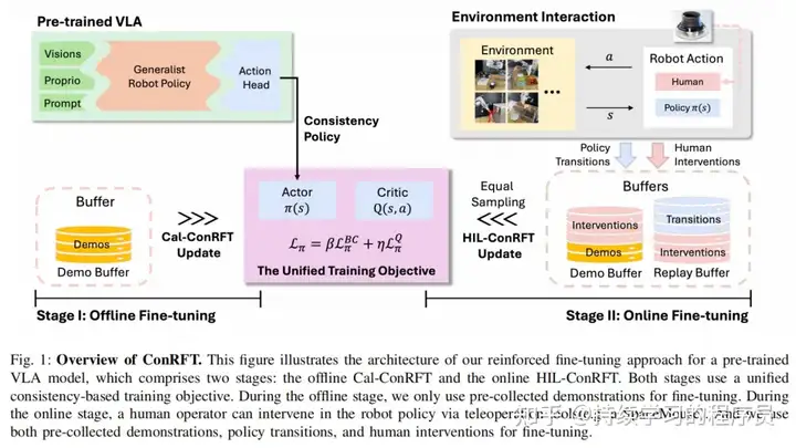 介绍:《RSS 2025|ConRFT: 真实环境下基于强化学习的VLA模型微调方法》,此文章讲得挺清楚了。如上面所述,此工作也是一个两阶段的训练范式,第一阶段离线强化学习,第二阶段在线强化学习。在工程实现上,它基于hil-serl的框架,但hil-serl只是一个online的训练范式。