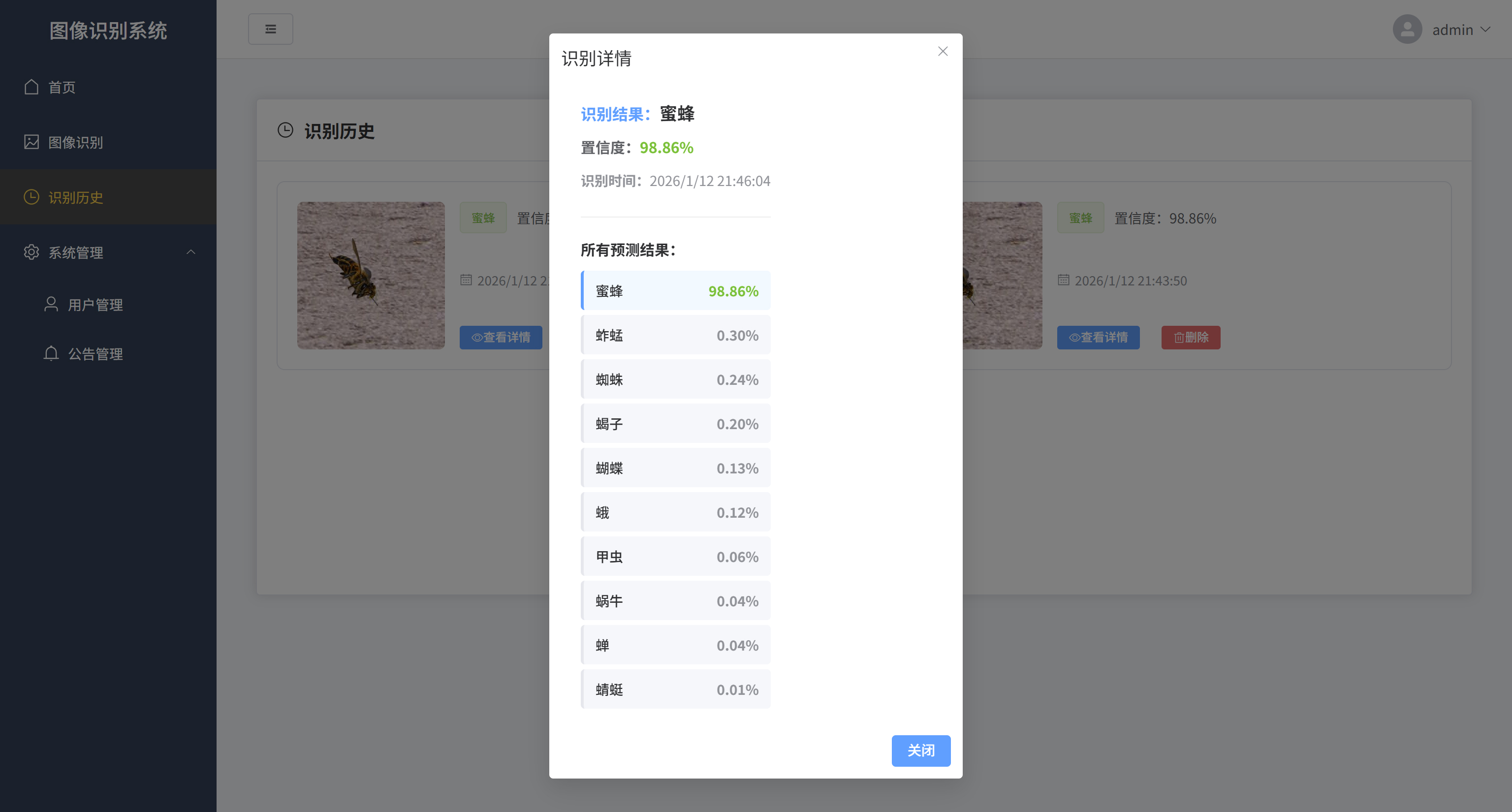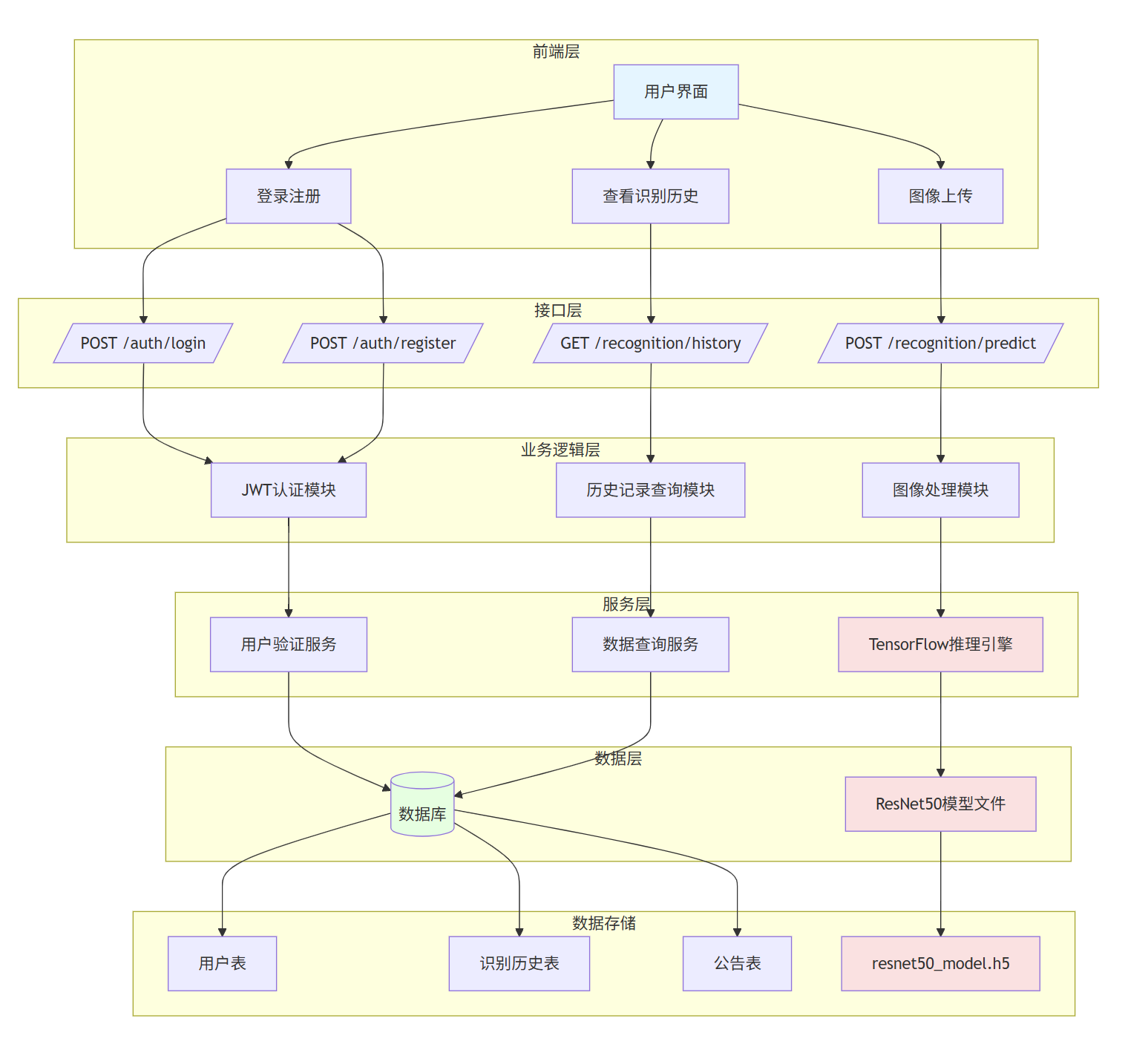 本系统是一个基于深度学习的昆虫智能识别Web应用,旨在为用户提供便捷、高效的昆虫图像识别服务。系统采用B/S架构设计,前端通过Flask RESTful API与后端进行交互,后端集成TensorFlow深度学习框架和ResNet50预训练模型,实现对10种常见昆虫(蜜蜂、甲虫、蝴蝶、蝉、蜻蜓、蚱蜢、蛾、蝎子、蜗牛、蜘蛛)的精准识别。系统核心功能包括用户注册登录、图像上传识别、识别历史记录查询、用户管理以及公告发布等。用户上传昆虫图片后,系统将自动进行图像预处理、特征提取和分类预测,返回识别结果、置信度以及所有类别的预测概率,并将识别记录保存到数据库中供用户后续查看。系统采用JWT令牌认证机制保障用户数据安全,使用SQLite数据库存储用户信息、识别记录和公告数据,并通过Flask-Migrate实现数据库版本管理。整个系统具有良好的可扩展性和用户友好的交互体验。
