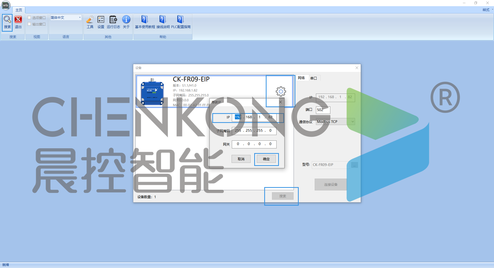 - 注:搜索设备出来后,可以点击齿轮修改设备IP地址