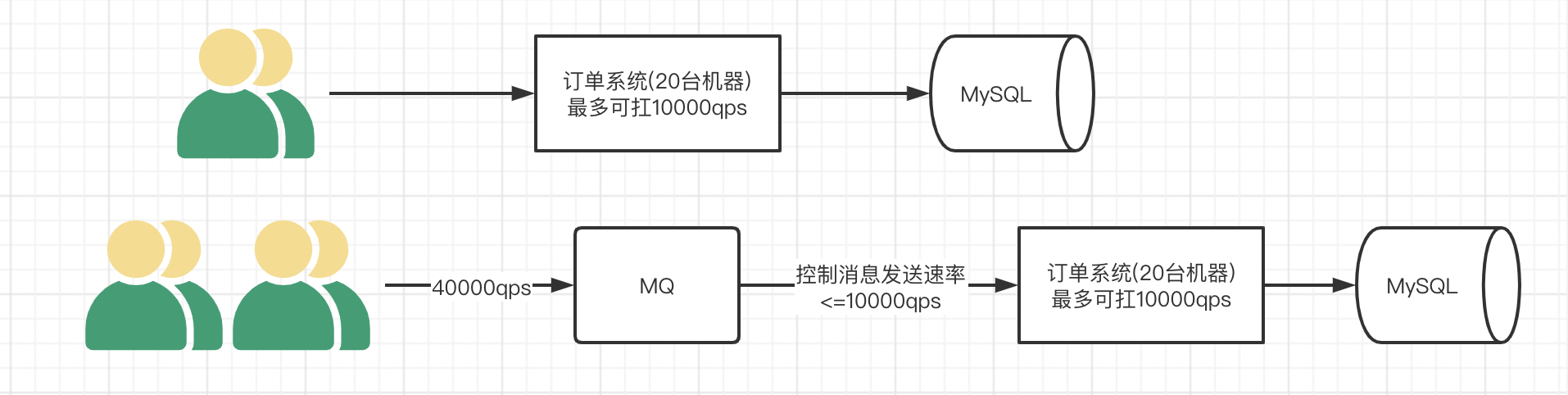 举个例子,假设某订单系统每秒最多能处理一万次订单,也就是最多承受的10000qps,这个处理能力应付正常时段的下单时绰绰有余,正常时段我们下单一秒后就能返回结果。但是在高峰期,如果有两万次下单操作系统是处理不了的,只能限制订单超过一万后不允许用户下单。使用消息队列做缓冲,我们可以取消这个限制,把一秒内下的订单分散成一段时间来处理,这时有些用户可能在下单十几秒后才能收到下单成功的操作,但是比不能下单的体验要好。