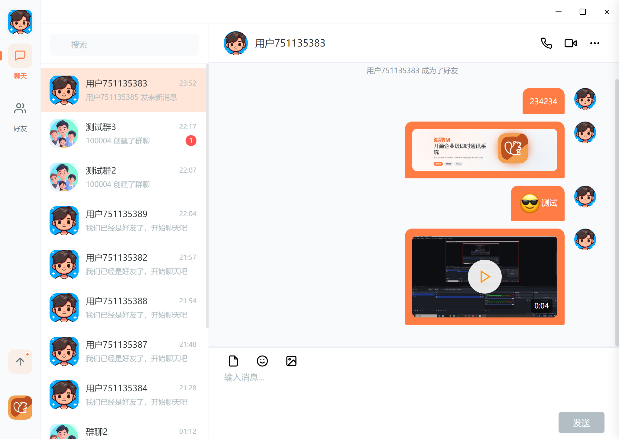 完整的消息收发界面,支持文本、图片、视频、音频等多种消息类型,实时消息推送。