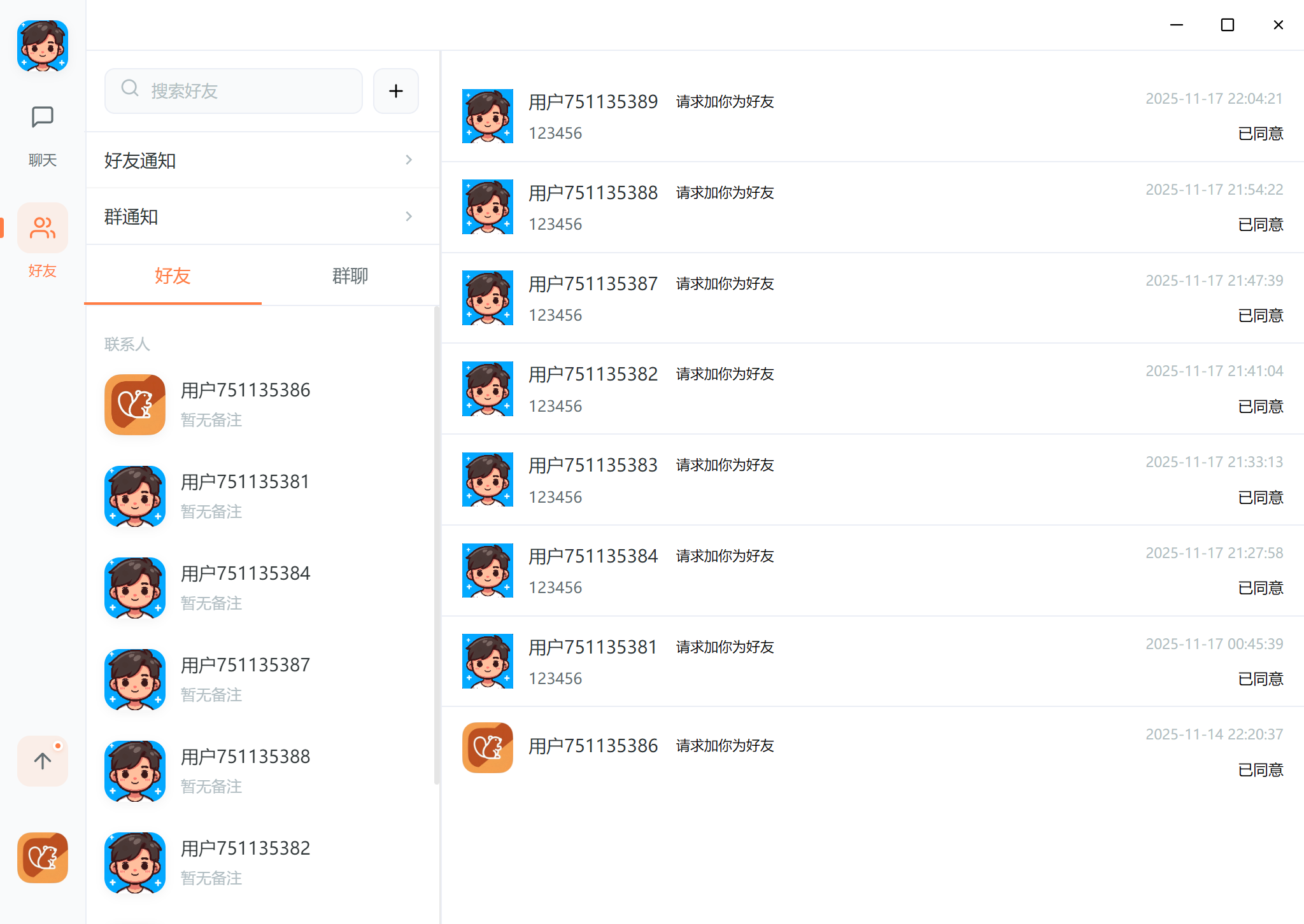 好友申请处理界面,支持同意、拒绝好友申请,查看申请详情。