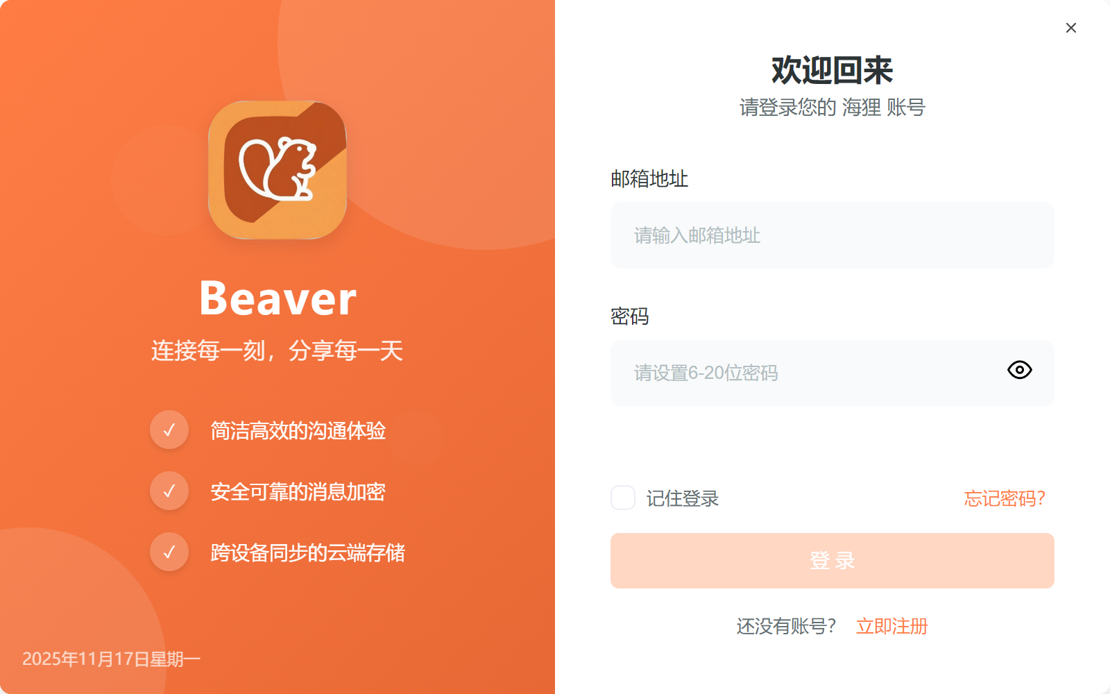 经过持续优化和功能完善,海狸IM桌面版 v1.1.0 正式发布!基于 Vite + Electron 的现代化构建方案,带来更快的启动速度、更流畅的用户体验和更完善的IM功能。