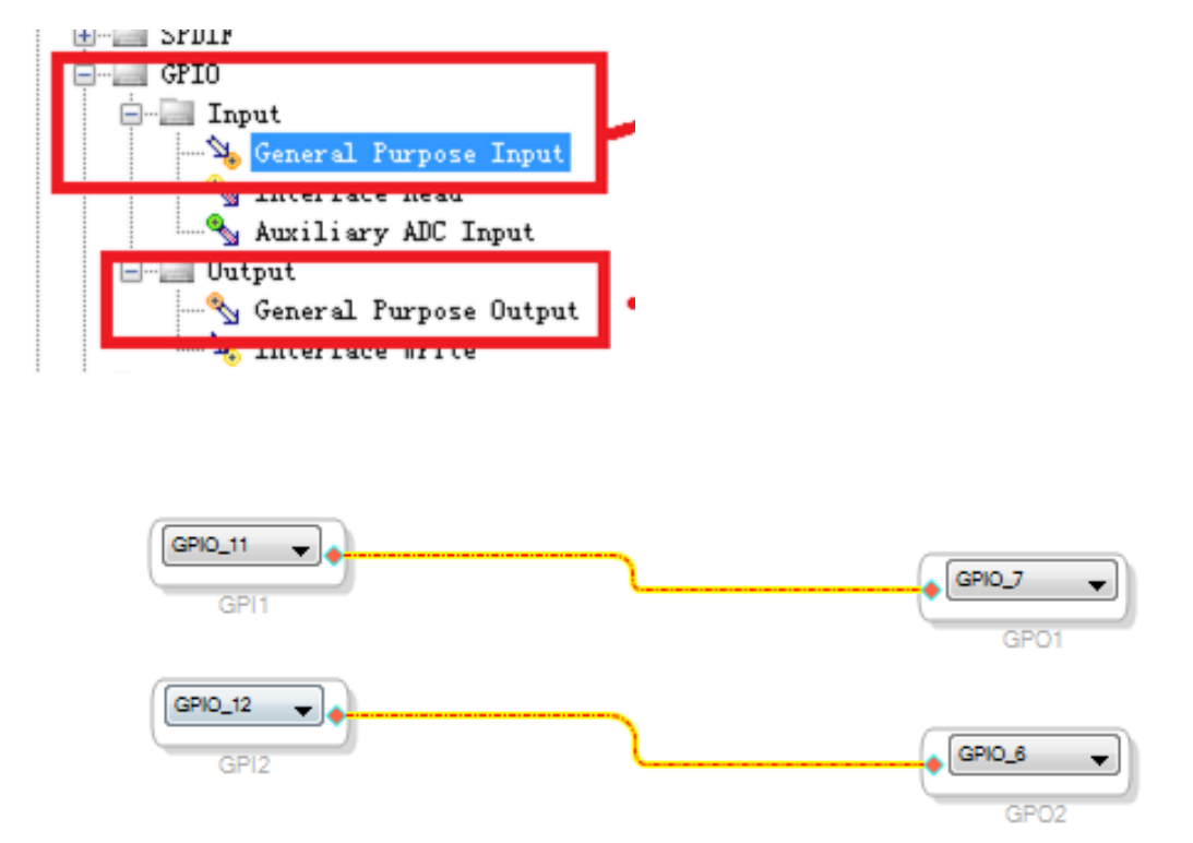 如果要让板子上的按键控制 LED 灯,可做以下操作,拖出 input 和 output,并下拉指定接口即可。