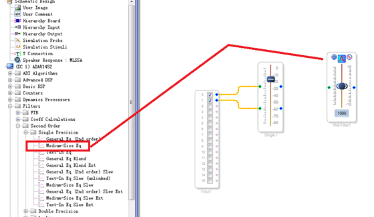 1)在工具栏中点开 Filters 模块组, 依此选中/点开 Second Order>Single Precision, 然后把Medium Size Eq 模块拖到工作区。