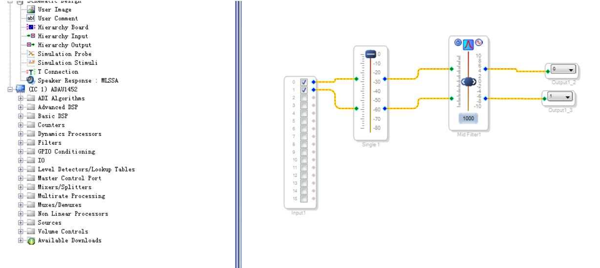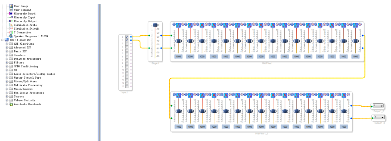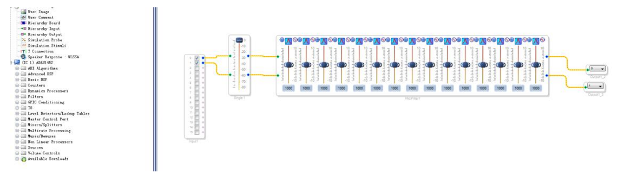 做到这里,说一个题外话,很多用户都问 Sigmadsp 到底能做几段 EQ,我想说的是,芯片的资源是有限的,我也说不好你的设计中,EQ 占了芯片多少资源,其他功能模块占了多少资源,到底最后留给 EQ 的能做出几段来。但软件上实现 EQ 是非常容易的,你只需要自己亲自试一下,把你的系统都搭好,看看增加到多少段 EQ,USBi 下载没问题。一旦 USBi 下载出错,那就可能是超出了芯片的能力范围,这个临界值就是你的 EQ 段数啦。