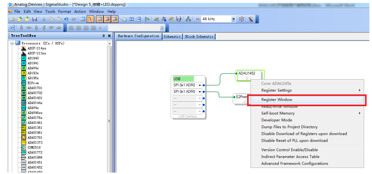 我们回到 Hardware 的界面,选中 ADAU1452,点鼠标右键,并选择 Register Window,打开寄存器配置页面。