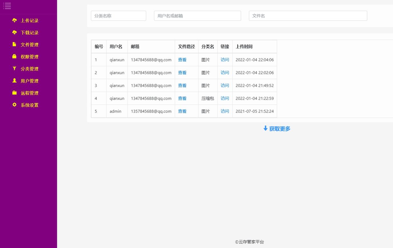 (5)上传记录:所有用户上传文件的历史记录都记录在该模块,每当有用户上传文件时,系统都会自动记录下来并保存相关信息,如上传时间、用户、文件名称、文件大小等。
