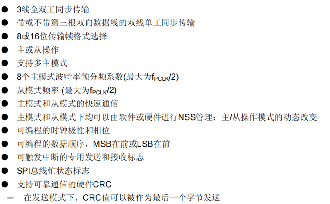 - 外设的读写操作同步完成,只进行写操作,则忽略读操作;主机只进行从机的读操作,则主机须发送一个空字节给从机引发传输。