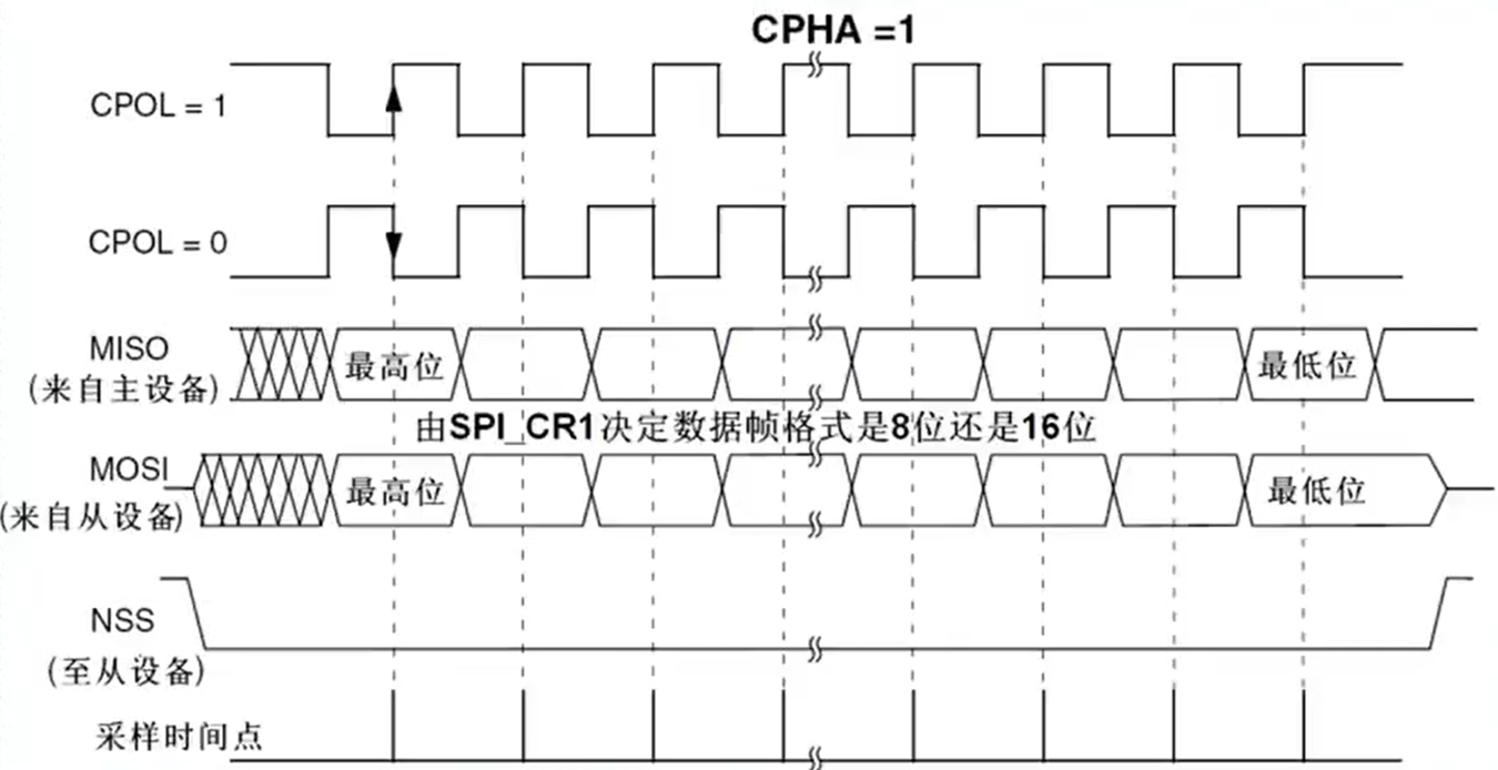 - 如果CPHA(时钟相位)位被置'1',SCK时钟的第二个边沿(0为下降沿,1为上升沿)进行数据位的采样,数据在第二个时钟边沿被锁存。