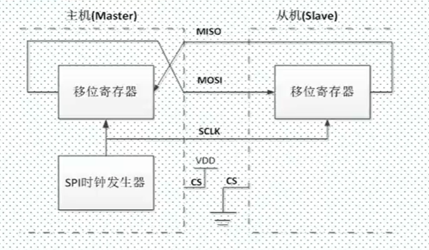 - 主机和从机都有一个串行移位寄存器,主机通过SPI的串行移位寄存器写入一个字节发送一次传输。